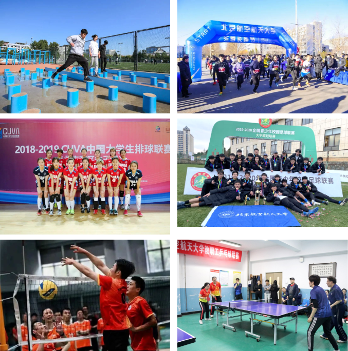 北航一直有着优良的体育传统,获评全国体育教学优秀高校,率先建成全国首条体能锻炼走廊,涵养了浓厚的体育文化氛围。学校始终高度重视体育工作,面向全校开设了52门体育课程,每年举办长跑节、大学生足篮排羽乒等多项校级比赛,男排、女排、男足等高水平运动队多次获全国冠军,教职工体育运动也蓬勃开展。