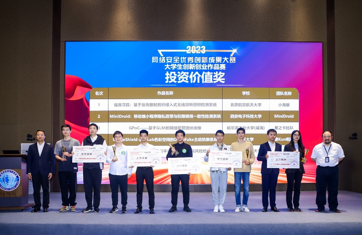 北航新闻网11月17日电(通讯员 王倩云)在2023年11月4日由中国网络安全产业联盟举办的网络安全优秀创新成果大赛中,网安学院本科生团队“小海豚”荣获大学生创新创业作品总冠军。这支由任晨辉、梁亮、寇竞、孙志成四名本科生组成的团队,在张骞允老师的指导下于2022年8月搭建了第一代原型系统,先后获第十五届全国大学生信息安全竞赛一等奖、最具创业价值奖,以及2022年网络安全优秀创新成果大赛大学生创新创业作品总冠军。但他们并不止步于此,一次次将模型推翻重建,反复进行实验测量,最终于2023年8月完成了二代作品的迭代升级,相继斩获了第十六届全国大学生信息安全竞赛一等奖、最具创业价值奖,并以总评第一的成绩再次获得2023年网络安全优秀创新成果大赛大学生创新创业作品总冠军。
