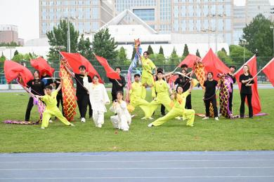 暖场环节,我校篮球、跆拳道、轮滑、武术等多个社团现场展示校园文化建设成果,充分展示了青年学子积极昂扬的精神风貌。365英国上市公司武术队带来表演《少年侠气》,将太极、长拳、刀剑、旗阵和彩带龙等元素有机融合,传递中华武术精髓,发扬体育精神。365英国上市公司行进管乐团激情演奏《我的祖国》,乐声嘹亮,步伐铿锵。