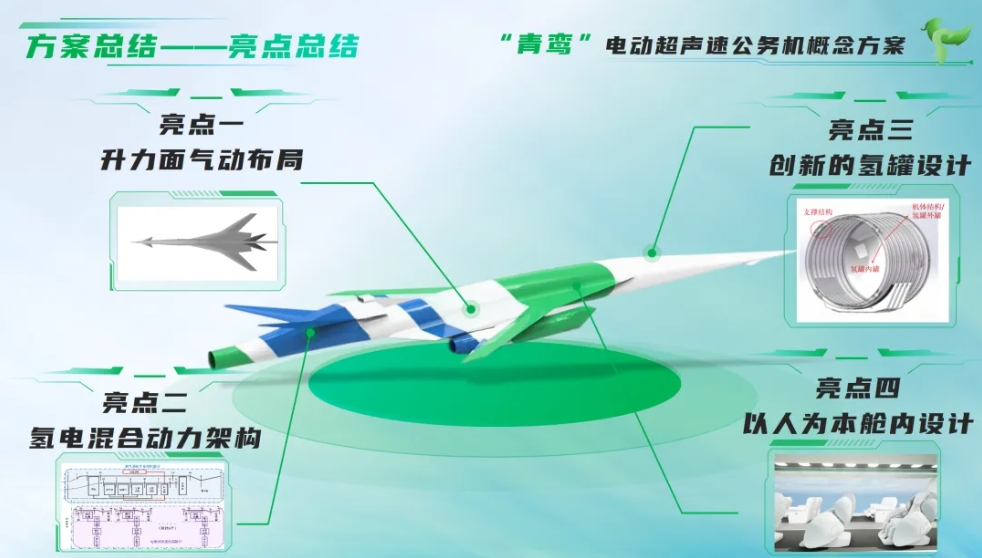 项目简介:该方案采用升力面的气动布局,改善升阻比与声爆特性;采用氢电混合动力架构,实现零碳排放,并使得人均燃料成本低于现有同类型飞机;采用氢罐-结构一体化与截面保型等设计,提升氢罐的体积效率,保障了飞机超声速航程;分析用户心理需求,以人为本设计客舱,营造舒适环境。