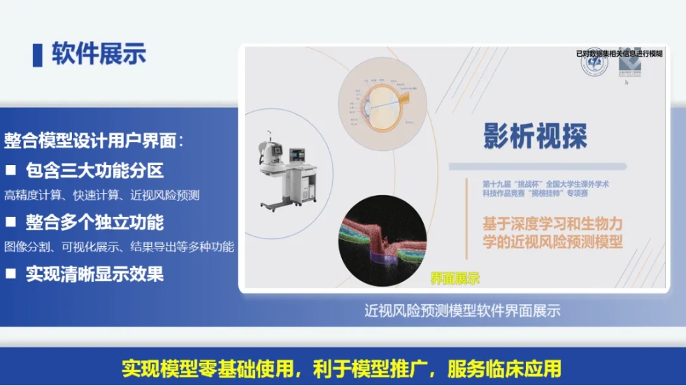 项目简介:本研究开发了一种新型的近视风险预测模型,以常规眼科检查中获取的眼科OCT图像为参考数据,开发了基于数字体图像相关方法(DVC)的眼后节生物力学属性特征精确提取模块,基于深度学习的力学特征快速提取模块和基于单次OCT扫描的近视风险快速筛查模块,实现了对眼后节生物力学特性的无创、无感测量,为近视防控和眼科学研究做出贡献。