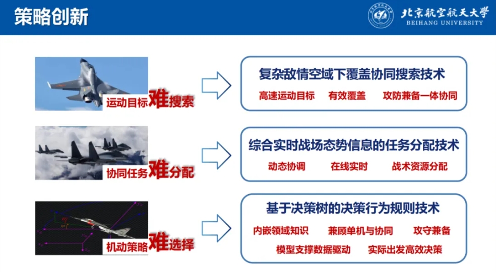 项目简介:针对无人机集群在超视距空战中面临的“运动目标难搜索、协同任务难分配、机动策略难选择”等难点,团队基于“模型支撑、数据驱动”思路,创新设计攻防兼顾、智能协同、高效决策的内嵌领域知识的无人机智能协同博弈决策技术。在赛方平台上,面对两种典型场景和,所设计的算法均高效无损地完成对对方飞机的打击任务,展现了优异的技术性能。