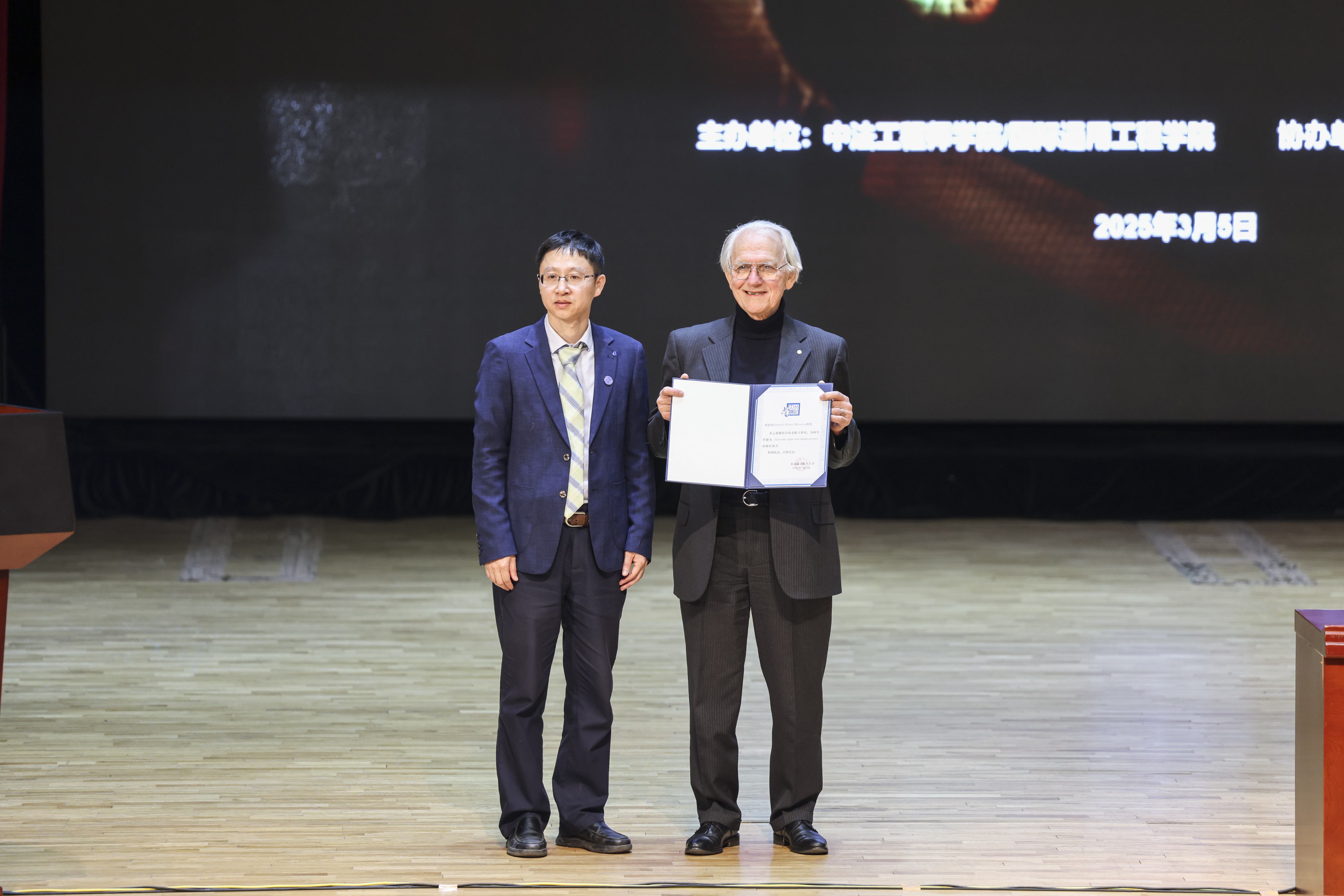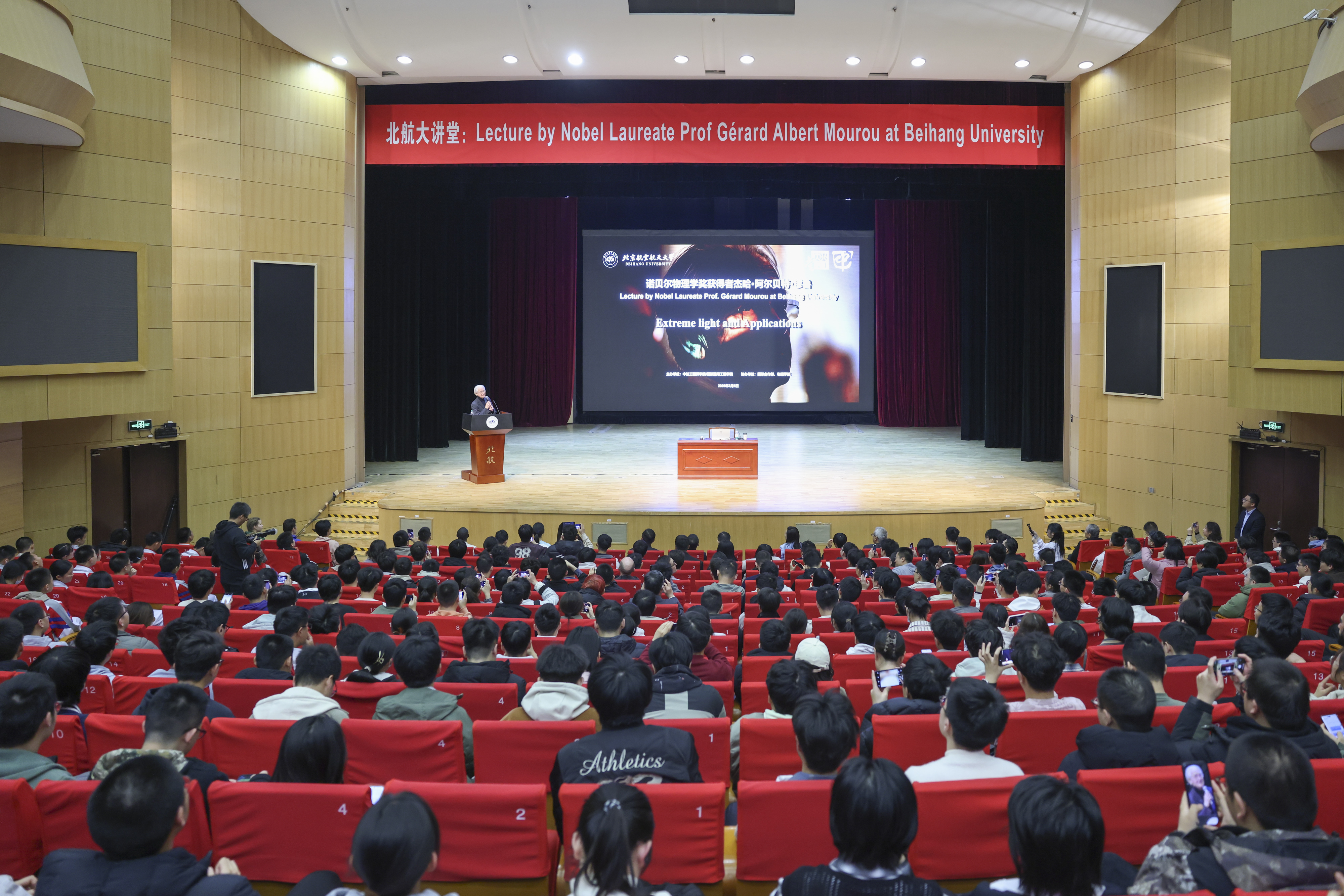 3月5日下午,晨兴音乐厅气氛热烈,座无虚席,Mourou教授做客北航大讲堂,为800余名北航师生和来自北京市八一学校“北航班”的50名师生现场作报告。副校长吴江浩致辞,并为Mourou教授颁发北航大讲堂荣誉证书。中法工程师学院院长耿立升主持讲座。