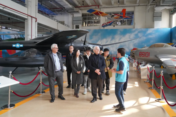 在航空航天博物馆,中法工程师学院的两名学生讲解员叶雨坤和瑞斯安(Tristan)向Mourou教授介绍了博物馆的历史及主要展品。参观过程中,Mourou教授对展品的珍稀性和保存完整度表达了高度赞赏,同时也对北航在培养航空航天人才和推动科技进步方面作出的卓越贡献给予了高度评价。