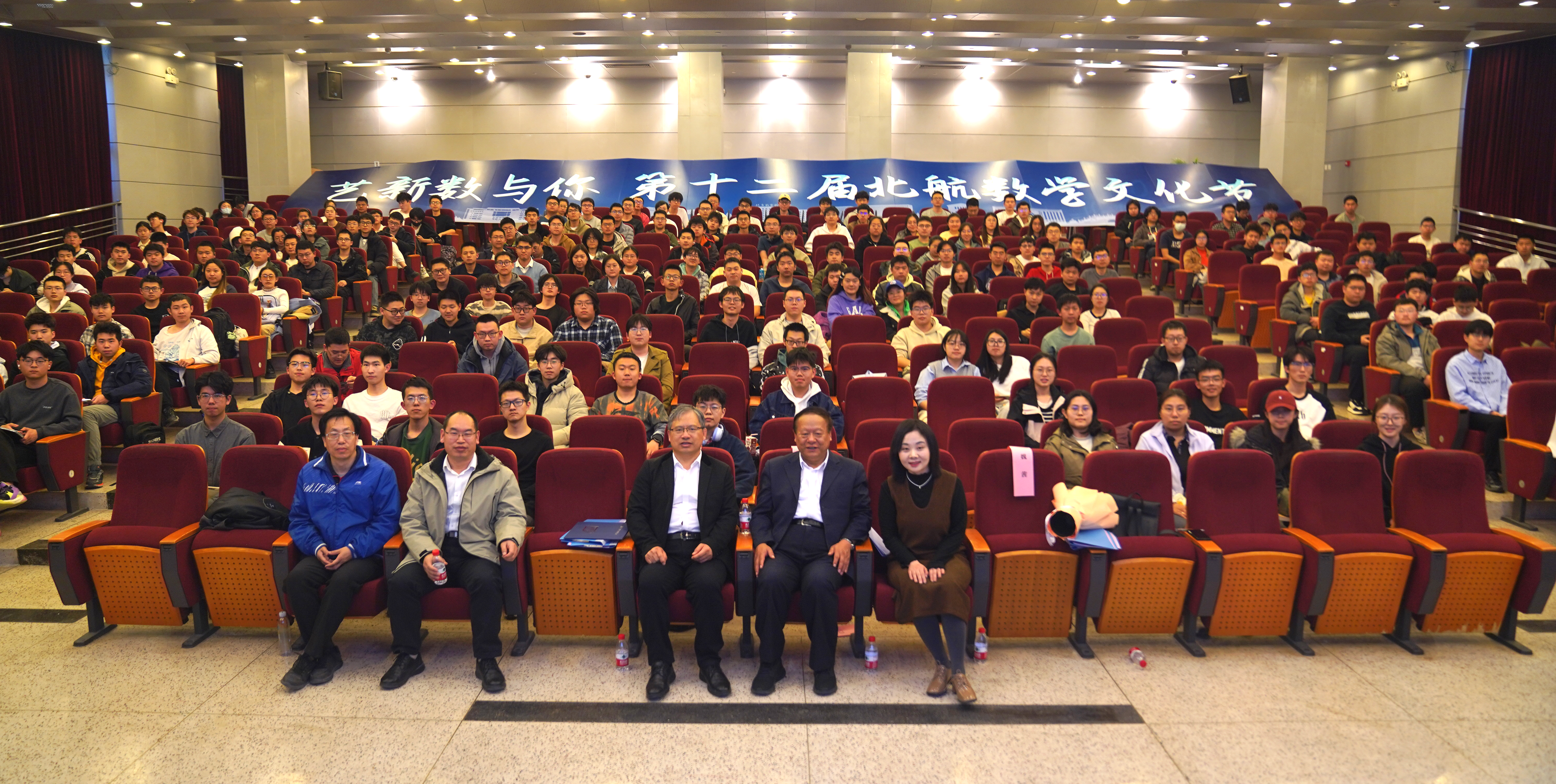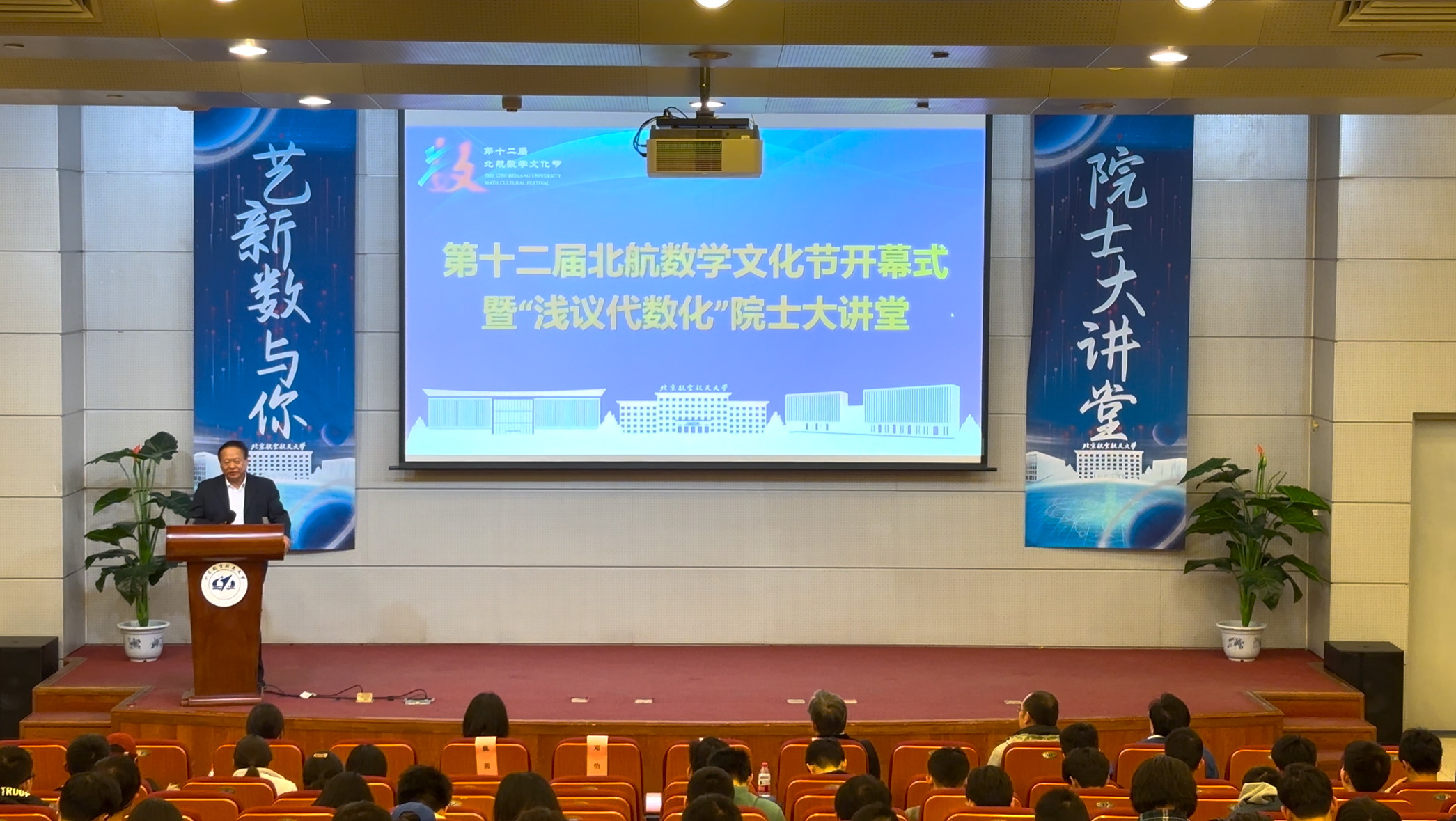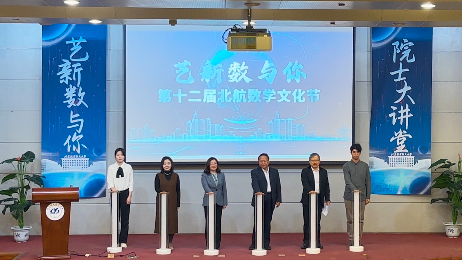 张继平、邓怡、韩德仁、魏茜、本研学生代表共同为第十二届北航数学文化节揭幕。伴随着倒计时与绚丽的光影,2025年“艺新数与你”数学文化节正式开幕。
