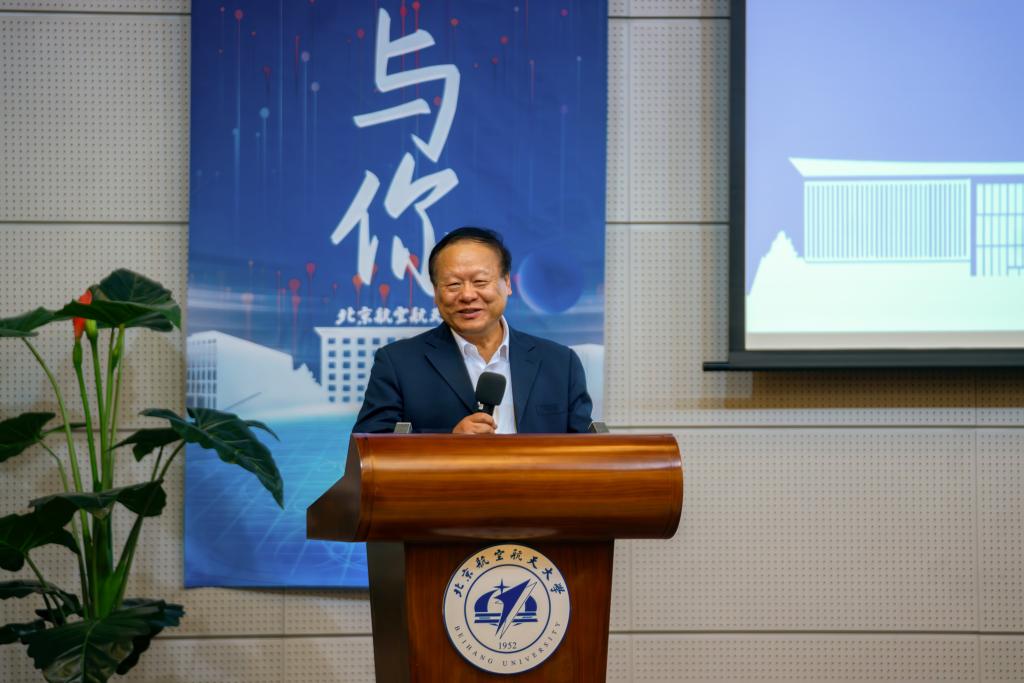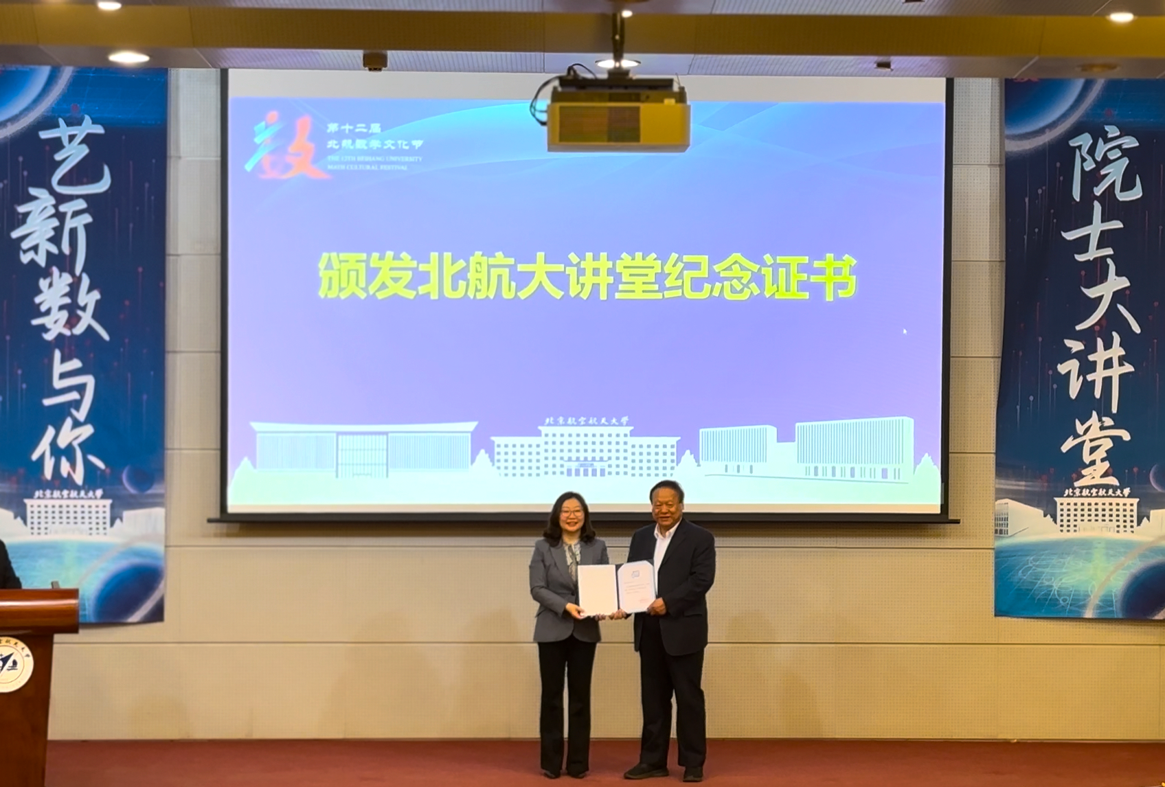 邓怡为张继平颁发北航大讲堂纪念证书。