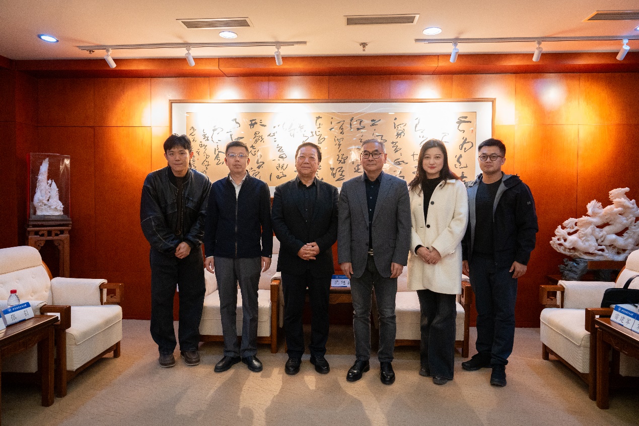 讲座开始前,美育中心主任兼新媒体艺术与设计学院院长沈旭昆、新媒体艺术与设计学院党委书记苗建军等与张夫也亲切交流并赠送北航特色纪念品。