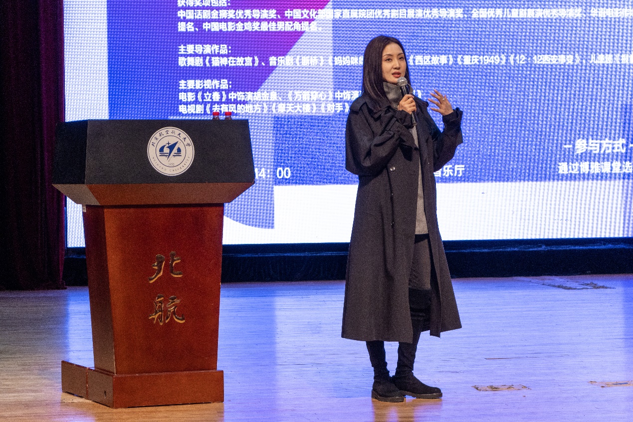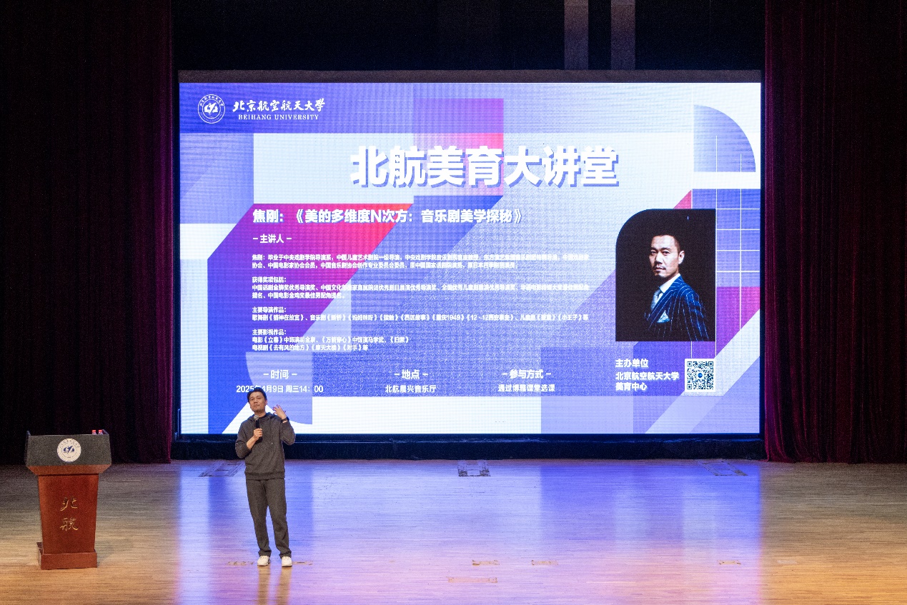 北航新闻网4月11日电(通讯员 高蕊 张西贝)4月9日下午,北航美育中心特邀中国儿童艺术剧院一级导演、中央戏剧学院音乐剧系客座教授、东方演艺集团音乐剧团特聘导演焦刚做客美育大讲堂,为师生带来“美的多维度N次方:音乐剧美学探秘”美育主题讲座。讲座由北航美育中心副主任宋泽惠主持。