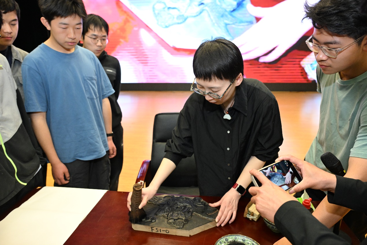 王艳介绍了杨柳青木版年画的传承与历史发展,以多幅经典作品为例细致讲述了年画蕴含的民俗文化内涵和独特艺术风格。她以创作过程为切入点,深入浅出地讲解了杨柳青木版年画的绘画风格、细致的画工与雕工、惟妙惟肖展现人物的技巧以及写实、写意与超写实等多种风格的表现形式。她特别介绍了年画中用灯芯草绘制花树的独特技艺,让同学们对杨柳青年画这一传统艺术形式有了更为全面和深入的认知。