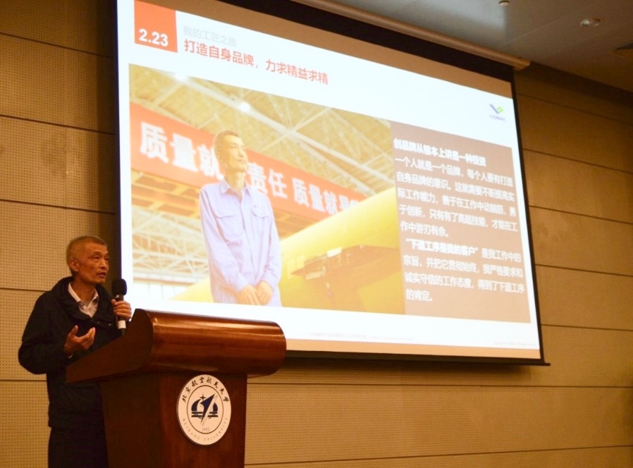 北航新闻网4月27日电(通讯员 郭金 崔飞)为大力弘扬劳模精神、劳动精神、工匠精神,营造崇尚劳动、尊重劳动、热爱劳动的氛围,4月23日下午,学校邀请中国商飞上海飞机制造有限公司技能大师、全国劳动模范、全国道德模范、“大国工匠”胡双钱在沙河校区做题为《弘扬工匠精神、铸造民机伟业》的精彩报告,200多名师生现场聆听报告。本次报告由党委学生工作部主办,航空科学与工程学院承办。