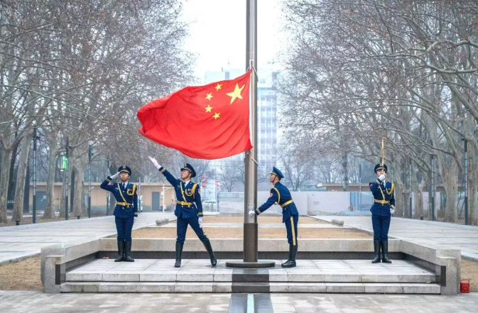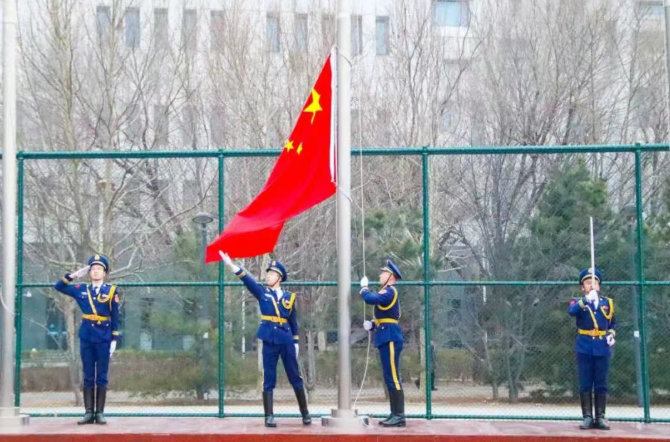 3月2日开学第一天清晨,升旗仪式庄严举行,红旗舒展,五星闪耀,厚植爱国情怀,凝聚奋进力量。
