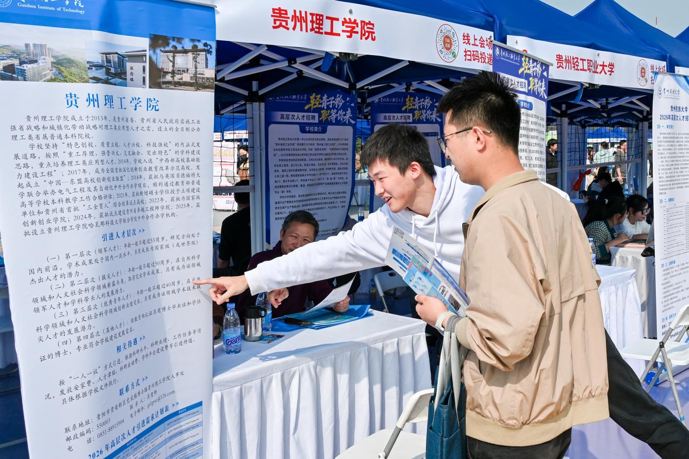 贵州省组团招聘同步亮相,组织省内42家高校、医院、科研院所,33家企业及9个市州,携2507个岗位、5522个人才需求,在京开展“赴省外知名高校招才引智——北京站”活动,同步走进清华、北大等26所985、211高校,广纳英才。组团单位覆盖教育、医疗、科研、产业等重点领域,以优厚政策与广阔平台,吸引北航学子投身西部建设、服务国家发展,深化区域人才协同与校地合作。