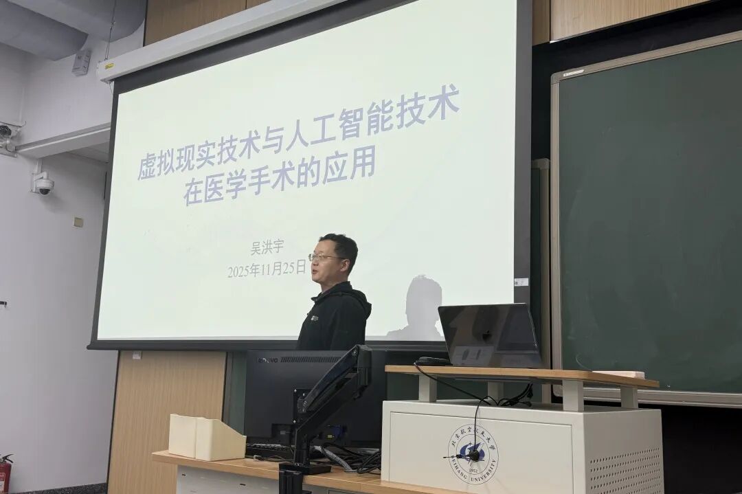 首先,由吴洪宇老师作题为《虚拟现实技术与人工智能技术在医学手术的应用》的报告。吴洪宇老师围绕虚拟现实与人工智能技术在医学手术中的应用展开讲座,系统介绍了二者在术前规划、术中导航与术后恢复三大环节中的关键作用。吴老师指出,随着数字医学理念的深入,VR与AI技术正逐步成为提升手术精度、降低医疗风险的重要支撑。